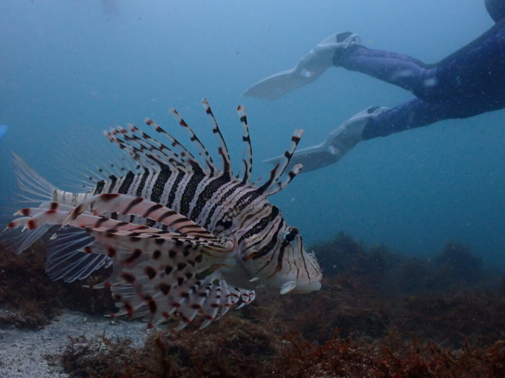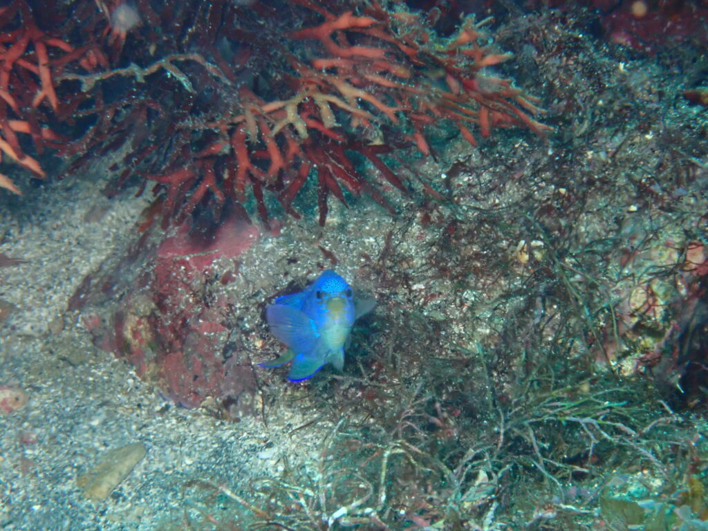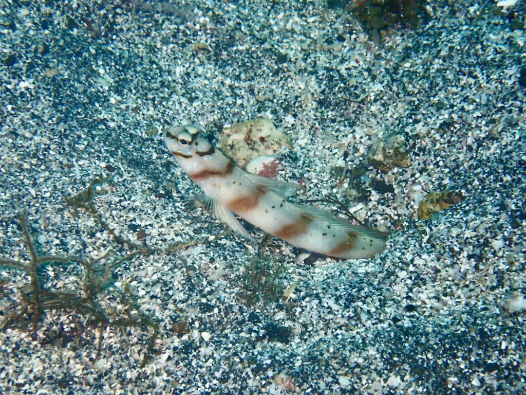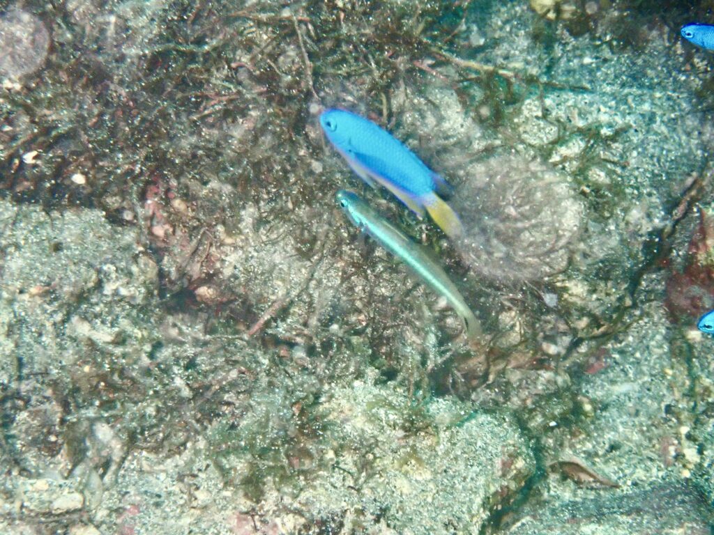 見た生物:ソラスズメダイ、アオリイカのペア、ダテハゼ、クビアカハぜ、ハチマキダテハゼ、セホシサンカクハゼ、クツワハゼ、オオモンハゼ、オグロクロユリハゼ、カサゴ、ワニゴチ、イバラカンンザシ、ウツボ
