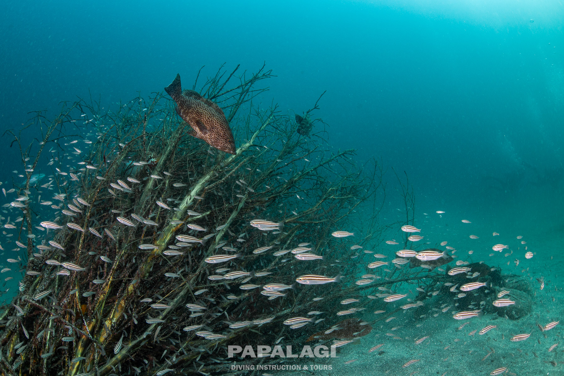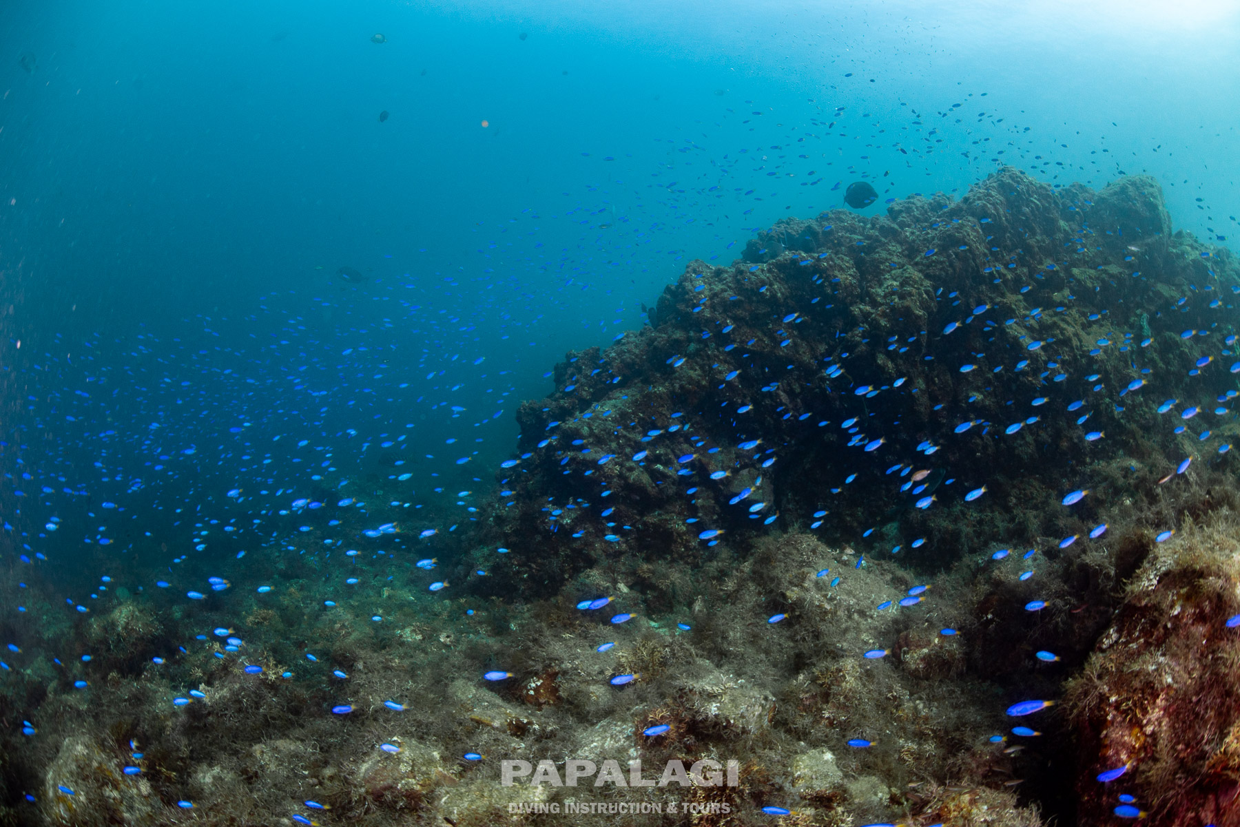 ソラスズメダイの群れやアオリイカ、ベニカエルアンコウ、イロカエルアンコウなど。