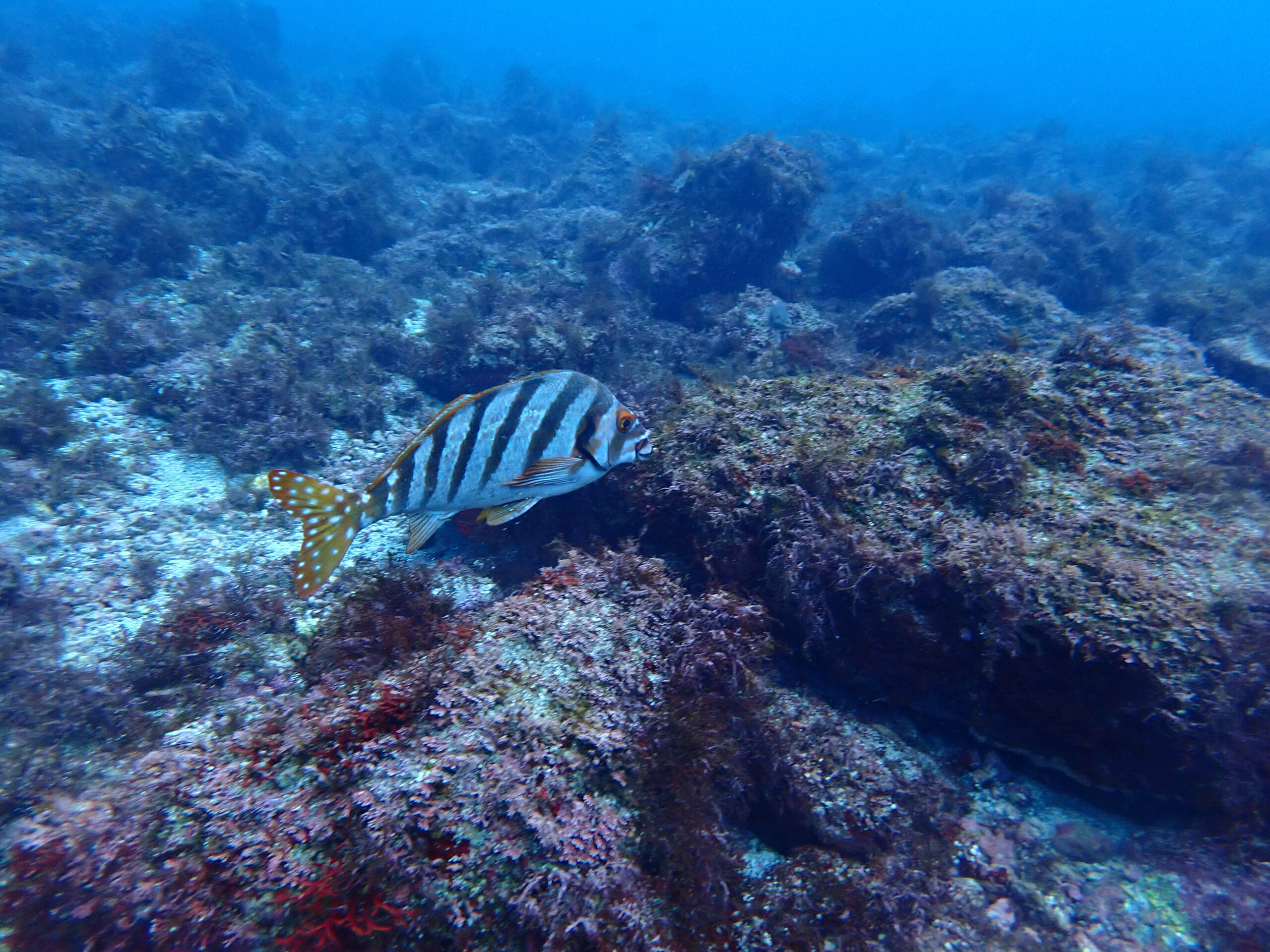 見られた生き物:イソギンチャクモエビ、ホウボウ、ミノカサゴ、コケギンポ、ミナミギンポ、コウベダルマガレイ、ウツボ、トラウツボ、サラサエビ、ウミスズメ、シマウミスズメ、イワシ群れ、タカノハダイ、ニザダイetc